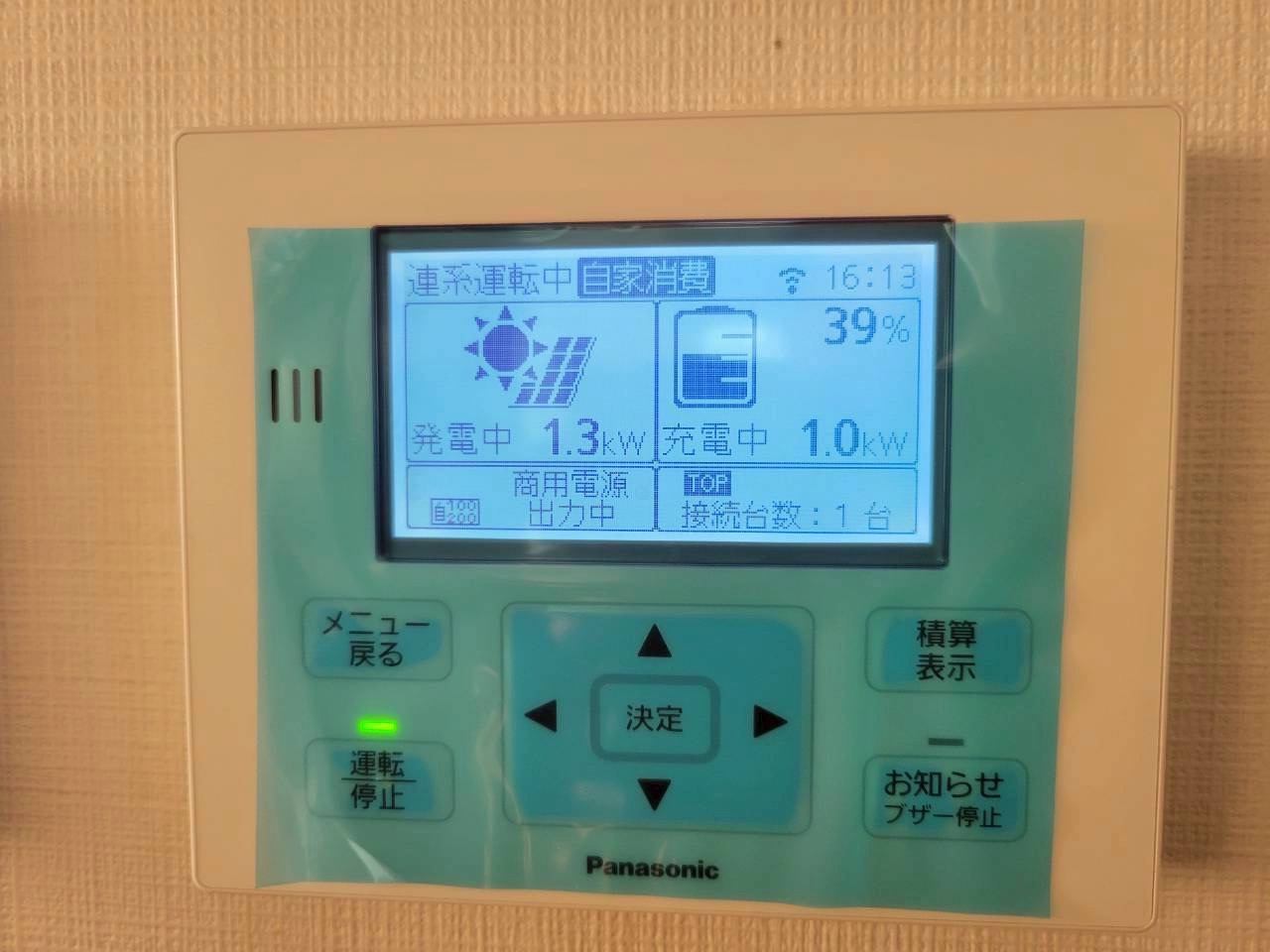 発電:1.2kW前後 蓄電池へ充電中 家庭内へ自家消費運転 余剰電力は売電